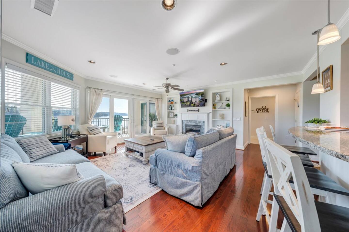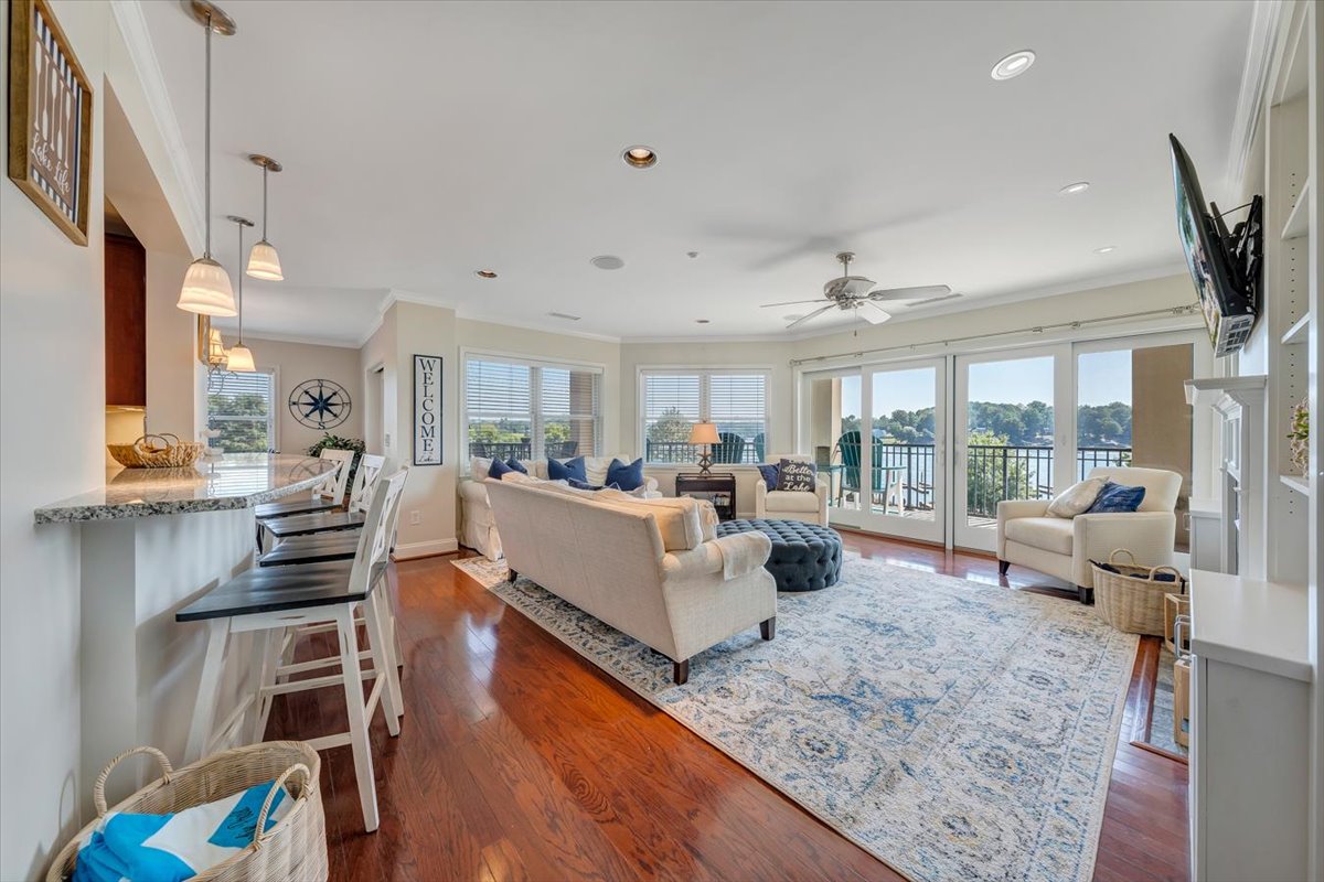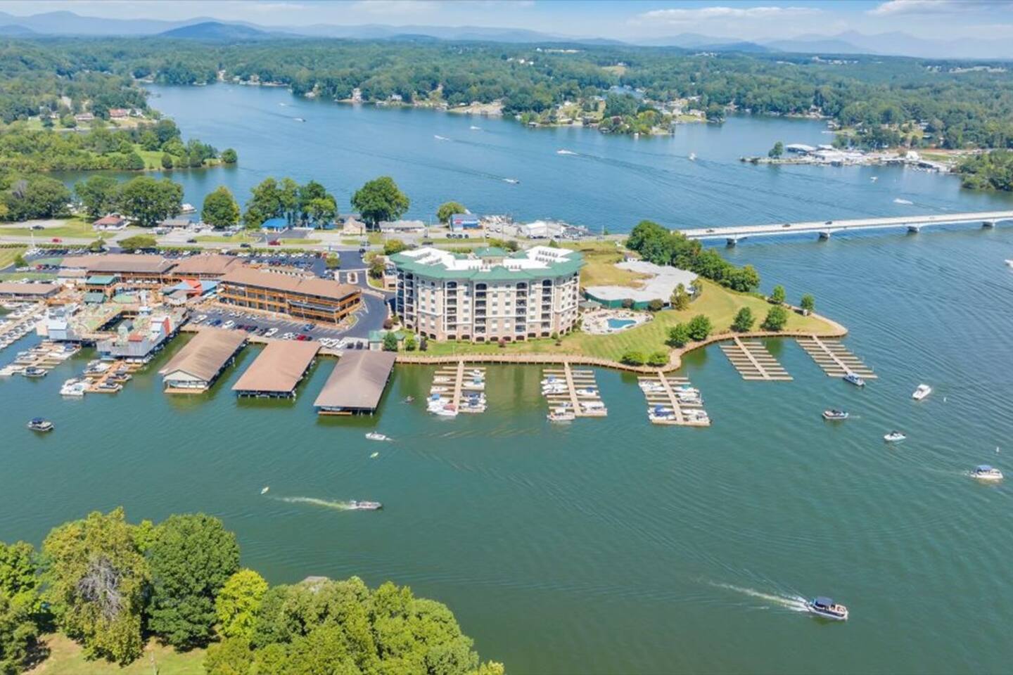This gorgeous luxury condo on Smith Mountain Lake has incredible 180 degree lake views and is the perfect place for your family getaway! This second floor Bridgewater Pointe Condo features private secure parking, secure building access, day docks, a boardwalk, an outdoor pool, and is located in the most convenient location on the lake. Adjacent to Bridgewater Plaza with shopping, restaurants, arcade, mini-golf, boat rentals, and more. Welcome to Paradise Pointe!!!
